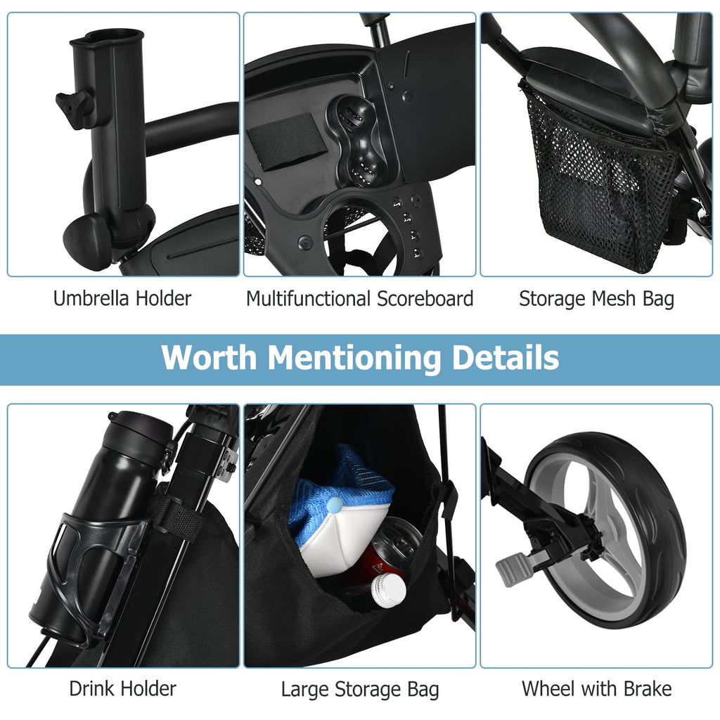 This Tangkula push cart checks a lot of boxes for casual and avid golfers alike. Its standout feature is the built-in seat, which provides real comfort during slow rounds or long waits at the tee box. Instead of leaning on your bag or standing around, you can simply take a load off whenever needed.